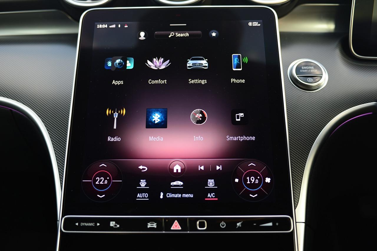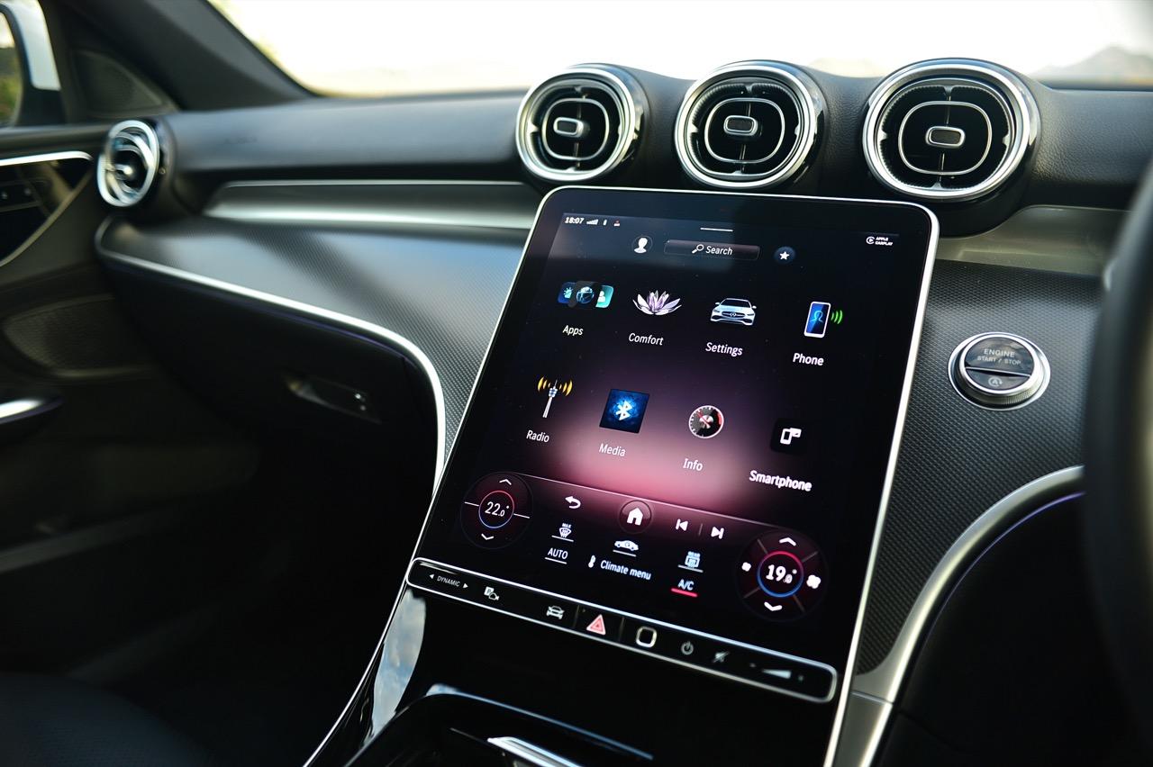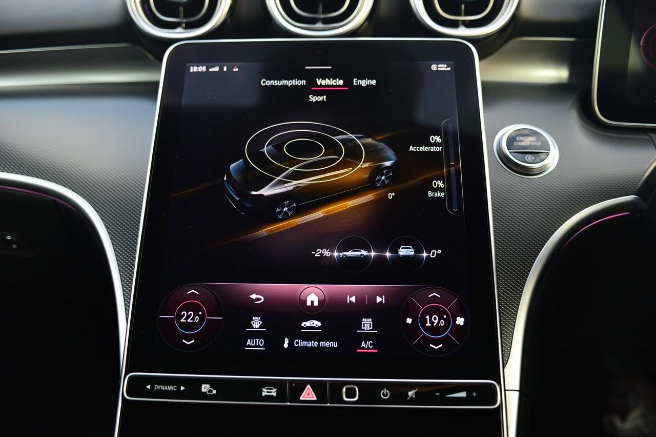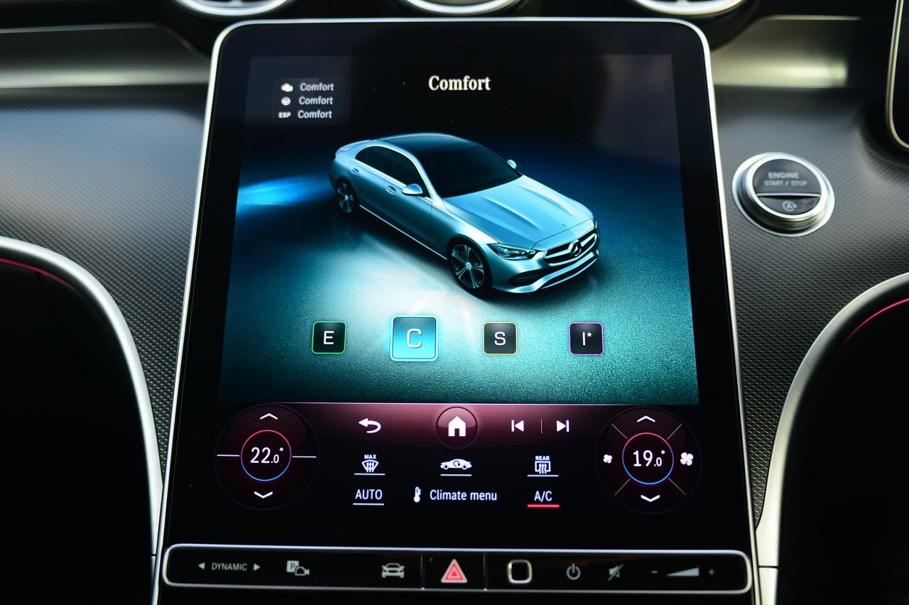 ระบบดิจิทัลยุคใหม่ ปรากฏอยู่ในจอแสดงผลส่วนกลางที่คล้ายกับ New S-Class จอกลางแนวตั้ง สามารถควบคุมและแสดงผลการทำงานของระบบต่างๆ การปรับตั้งและเชื่อมต่อฯ ผ่านการสั่งงานบนหน้าจอระบบสัมผัสคุณภาพสูง การวางจอภาพในแนวตั้งทำให้มองเห็นได้ชัดเจนและเกิดประโยชน์สูงสุดเมื่อใช้ระบบนำทางด้วยดาวเทียมหรือกล้องมองรอบคัน หน้าจอสัมผัสออกแบบให้ดูเหมือนลอยอยู่เหนือแดชบอร์ด เช่นเดียวกับชุดแดชบอร์ดที่หรูหรา หน้าจอมอนิเตอร์กลางปรับองศาให้เอียงเล็กน้อยไปทางคนขับ จอแสดงผลส่วนกลางขนาด 11.9 นิ้ว เป็นอุปกรณ์มาตรฐานของ New C-Class ทุกรุ่นอีกด้วย จอแสดงผลส่วนกลางยังมีการตกแต่งที่ลงลึกในด้านรายละเอียด เช่น การล้อมรอบจอภาพด้วยสีดำเงาวาวและขอบสีเงินที่ตัดกับสีดำและขยายไปยังคอนโซลกลางได้อย่างลงตัว รายละเอียดการตกแต่งที่ประณีต การตัดขอบด้วยโครเมียมคุณภาพสูง ช่วยให้ห้องโดยสารของ C220d AMG Dynamic น่ามองมากยิ่งขึ้นและเหมือนกับห้องโดยสารของ New S-Class ที่ถูกย่อสัดส่วน