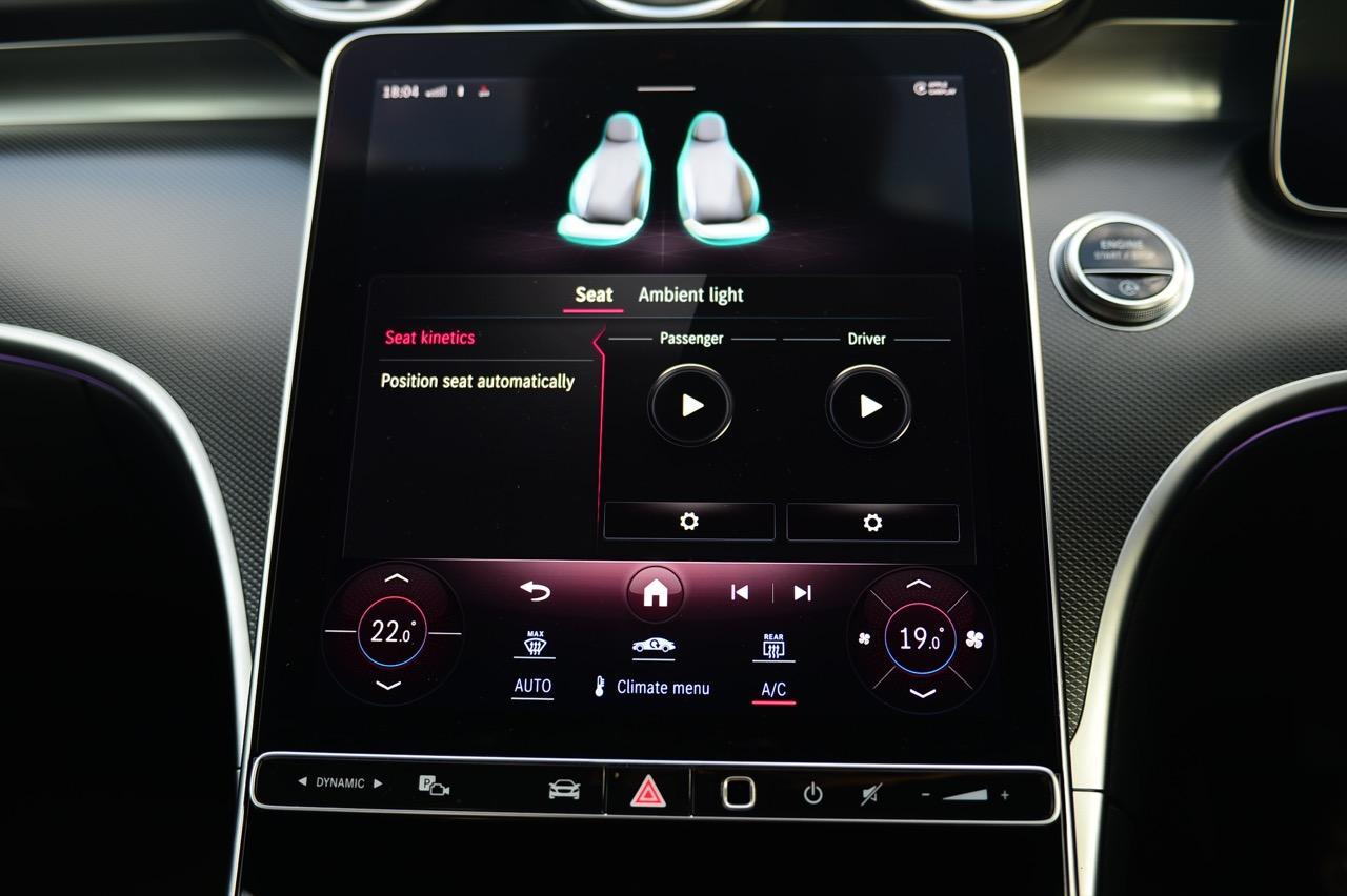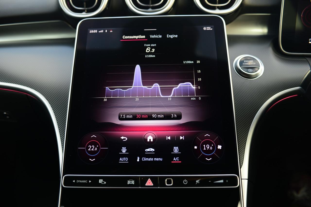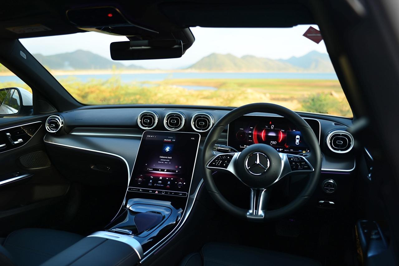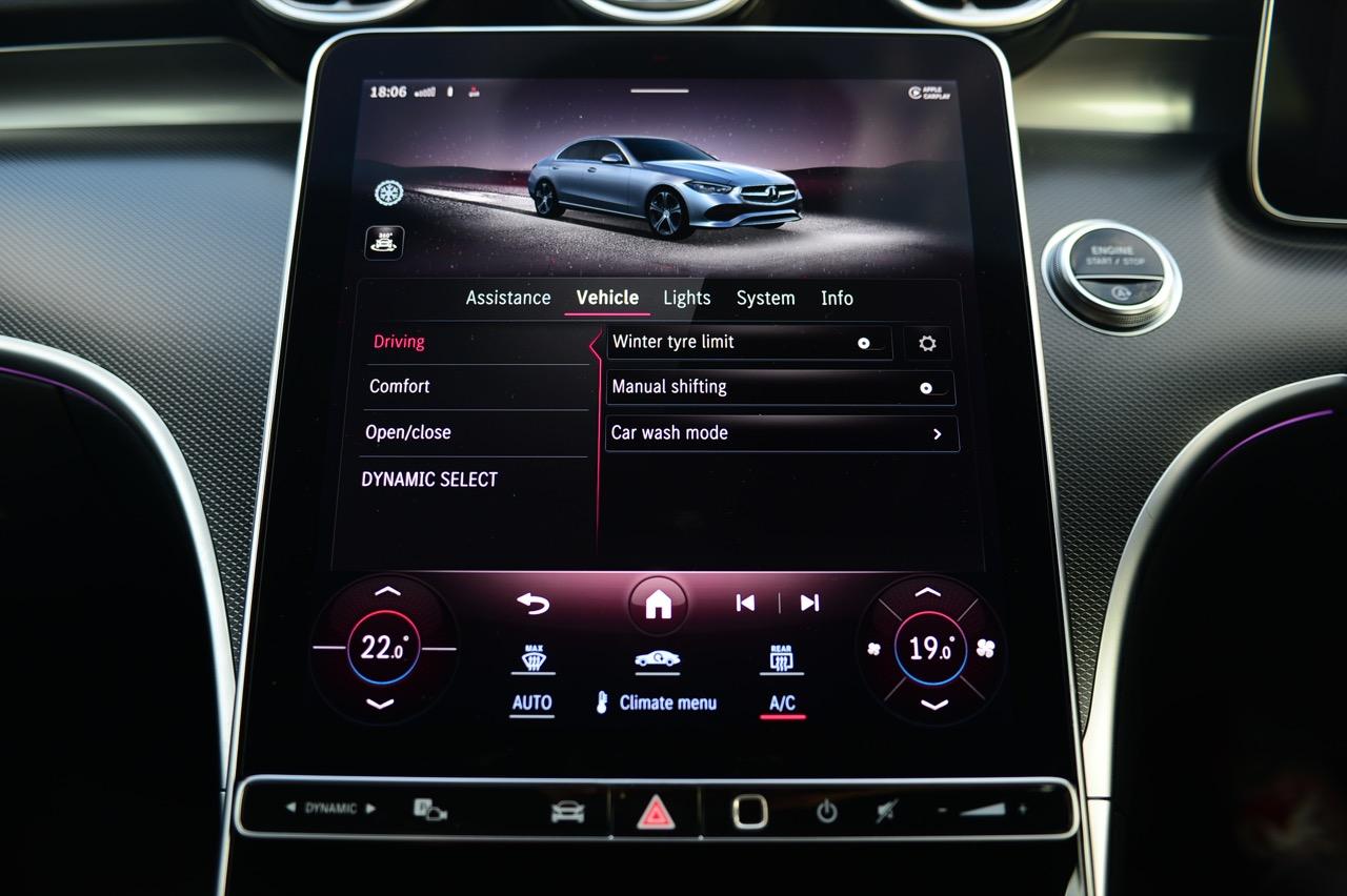 ระบบดิจิทัลยุคใหม่ ปรากฏอยู่ในจอแสดงผลส่วนกลางที่คล้ายกับ New S-Class จอกลางแนวตั้ง สามารถควบคุมและแสดงผลการทำงานของระบบต่างๆ การปรับตั้งและเชื่อมต่อฯ ผ่านการสั่งงานบนหน้าจอระบบสัมผัสคุณภาพสูง การวางจอภาพในแนวตั้งทำให้มองเห็นได้ชัดเจนและเกิดประโยชน์สูงสุดเมื่อใช้ระบบนำทางด้วยดาวเทียมหรือกล้องมองรอบคัน หน้าจอสัมผัสออกแบบให้ดูเหมือนลอยอยู่เหนือแดชบอร์ด เช่นเดียวกับชุดแดชบอร์ดที่หรูหรา หน้าจอมอนิเตอร์กลางปรับองศาให้เอียงเล็กน้อยไปทางคนขับ จอแสดงผลส่วนกลางขนาด 11.9 นิ้ว เป็นอุปกรณ์มาตรฐานของ New C-Class ทุกรุ่นอีกด้วย จอแสดงผลส่วนกลางยังมีการตกแต่งที่ลงลึกในด้านรายละเอียด เช่น การล้อมรอบจอภาพด้วยสีดำเงาวาวและขอบสีเงินที่ตัดกับสีดำและขยายไปยังคอนโซลกลางได้อย่างลงตัว รายละเอียดการตกแต่งที่ประณีต การตัดขอบด้วยโครเมียมคุณภาพสูง ช่วยให้ห้องโดยสารของ C220d AMG Dynamic น่ามองมากยิ่งขึ้นและเหมือนกับห้องโดยสารของ New S-Class ที่ถูกย่อสัดส่วน