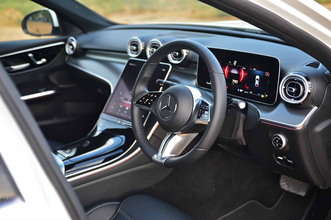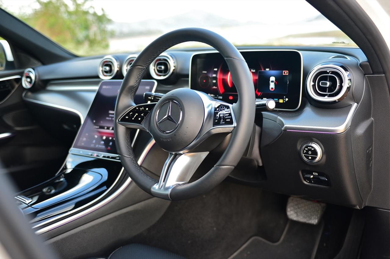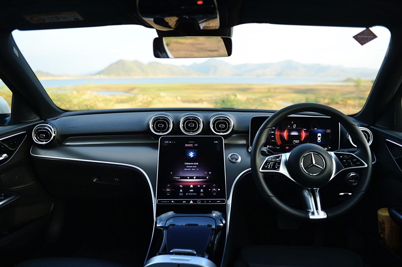 มีการแบ่งโซนการใช้งาน ทั้งส่วนบนและล่าง แดชบอร์ดคอนโซล มีลักษณะคล้ายปีกของอากาศยาน พร้อมช่องแอร์ทรงกลมแบบใหม่ที่มีดีไซน์แปลกตา ทำให้นึกถึงส่วนหน้าของเครื่องยนต์เทอร์โบเจ็ต ลอกแบบมาจาก Mercedes-Benz The New S-Class V223 ด้วยการตกแต่งที่งดงาม ความเฉียบคมของชิ้นงาน จากคอนโซลกลางไปยังแดชบอร์ด โฟกัสของคนขับเพิ่มความสปอร์ตด้วยแผงหน้าปัด TFT LCD และจอแสดงผลส่วนกลางที่วางองศาของจอภาพให้เอียงไปทางฝั่งคนขับเล็กน้อยประมาณหกองศา เพื่ออำนวยความสะดวกในการใช้งาน จอภาพมาตรวัดของคนขับ ติดตั้งหน้าจอ TFT thin film transistor ความละเอียดสูง ขนาด 12.3 นิ้ว เป็นอุปกรณ์มาตรฐาน มาตรวัดจอภาพแบบ Panorama แตกต่างไปจาก C-Class W205 ที่ใช้หน้าปัดทรงกลมแบบคลาสสิก การแสดงผลของหน้าปัดมาตรวัดสามารถปรับเปลี่ยนรูปแบบได้อย่างหลากหลาย ทั้งแบบสปอร์ต แบบคลาสสิก รวมไปถึงรูปแบบของระบบนำทางและระบบความปลอดภัยที่สามารถนำขึ้นมาแสดงผลบนจอภาพมาตรวัดได้อย่างคมชัด