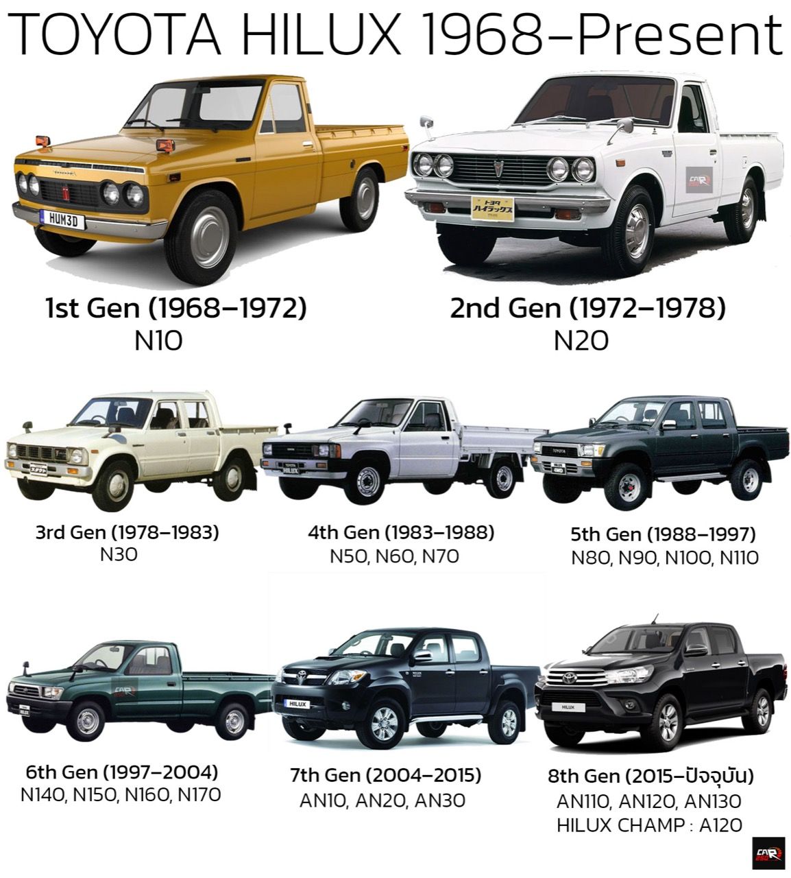 หลังการใช้งานหนักผ่านไป 3-5 ปีหรือนานกว่านั้น Toyota Hilux ได้รับชื่อเสียงอย่างรวดเร็วว่าเป็นรถปิคอัพเล็กที่ทนทานและเชื่อถือได้มากที่สุดเมื่อเทียบกับคลาสรถกระบะในระดับเดียวกัน เมื่อ Hilux มีวิวัฒนาการมากขึ้น ทำให้มันกลายเป็นรถออฟโรดยอดนิยม ด้วยการควบคุมที่คล่องตัว ราคาที่เข้าถึงได้ เหมาะสมกับภูมิประเทศของไทยที่ในอดีตกว่า 50 ปีก่อนนั้นเต็มไปด้วยเส้นทางทุรกันดาน ในตลาดโลก Toyota ขยายโมเดลไปยังรถกระบะขนาดกลางและขนาดใหญ่ นำเสนอคุณภาพและสไตล์ที่โดดเด่นเพื่อส่งขายในทวีปอเมริกาเหนือ ….