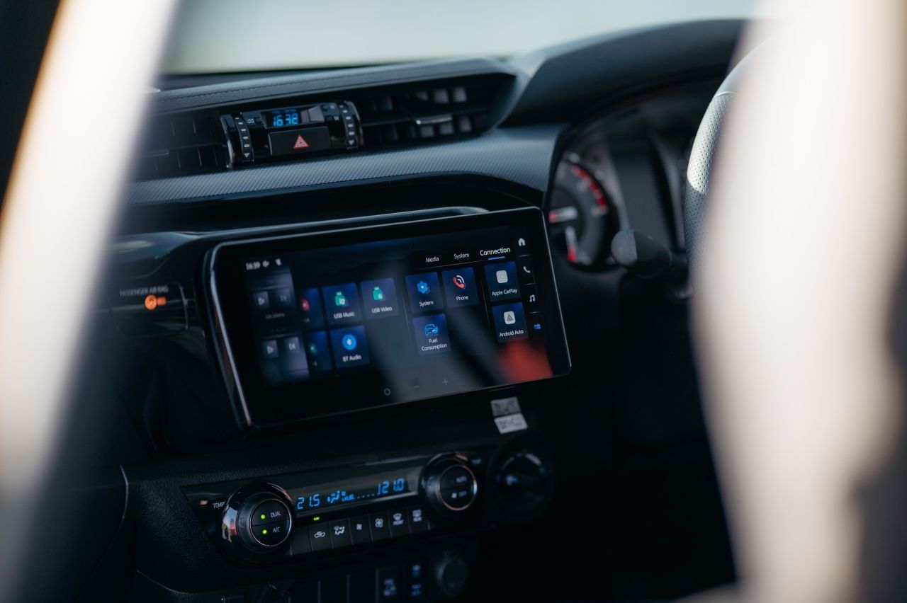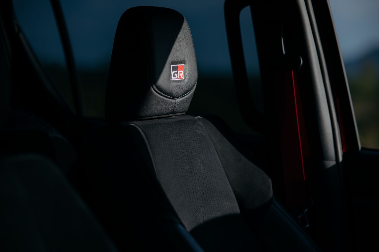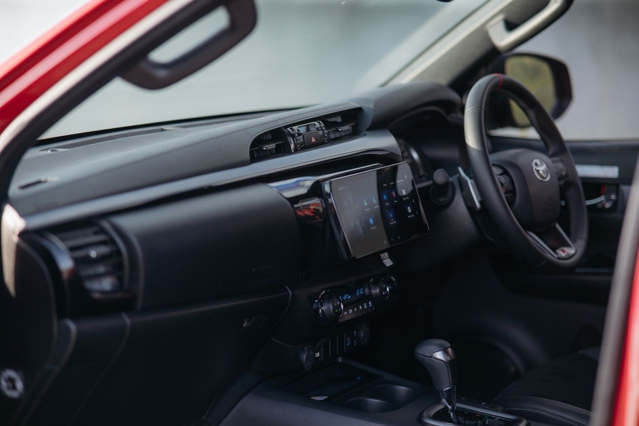 ภายใน Toyota Hilux Revo GR Sport มีรายละเอียดที่พิเศษ เช่น เข็มขัดนิรภัยสีแดง เบาะผ้า Suede กระชับ ดูดคนนั่งกับตัวเบาะได้ดี จอกลางอัปเกรดใหม่ขนาด 10 นิ้ว รองรับระบบ Apple Carplay และ Android Auto แบบไร้สาย และ T connect ทำให้การใช้งานภายในตัวรถสะดวกสบายมากขึ้น ระยะเบาะท้ายเท่ากับ Revo ทุกรุ่น นั่งสบายทัศนวิสัยดี ไม่เมารถ