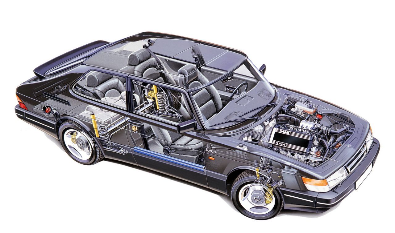 มรดกดีๆ หลายอย่างก็ถูกส่งทอดต่อมาจนถึงรุ่น 900 เจเนอเรชันแรก ที่คนรัก Saab มักเรียกกันว่า 900 Classic ซึ่งเผยโฉมในปี 1978 และขายควบคู่ไปกับ 99 รุ่นเดิม โดยยกเลิกตัวถังคูเป้ท้ายลาดใน 99 ก่อน เพราะ 900 เปิดตัวมาในแบบ 2 ประตูเป็นรุ่นแรก ก่อนจะตามมาด้วยตัวถัง 4 ประตูซีดาน 5 ประตู และเปิดประทุนในภายหลัง พื้นฐานของตัวรถหลายอย่างนั้น เป็นการยกยอดมาจากรุ่น 99 ทำให้มีมรดกความพิสดารและความล้ำลึกทางวิศวกรรมหลายอย่างที่เหมือนกัน อย่างแรกเลยก็คือ เมื่อคุณเปิดฝากระโปรงมา จะเห็นตัวเครื่องเป็นแบบวางตามยาว อย่าเพิ่งนึกว่าเป็นรถขับเคลื่อนล้อหลังนะครับ ทั้ง 99 และ 900 เป็นรถขับเคลื่อนล้อหน้าที่ใช้เครื่องวางตามยาว บางคนที่เป็นเรื่องรถหน่อยอาจจะบอกว่า อ๋อ เหมือนพวก Audi 80 กับ 100 ก็เกือบถูกครับ แต่เครื่องของ Saab นั้นจะหันกลับทิศ เอาตูดเครื่องหันมาหน้ารถ แล้ววางเครื่องเอียง 45 องศา พอท้ายเครื่องอยู่ด้านหน้า ก็มีชุดเฟืองต่อกลับจากข้างหน้า มาเจอชุดเกียร์ที่วางอยู่ข้างล่างเครื่องยนต์ แล้วค่อยไปขับเคลื่อนล้อคู่หน้า เป็นไงล่ะครับ ครั้งแรกที่อ่านเจอผมก็ตะลึงกับวิธีคิดของเขาเหมือนกัน