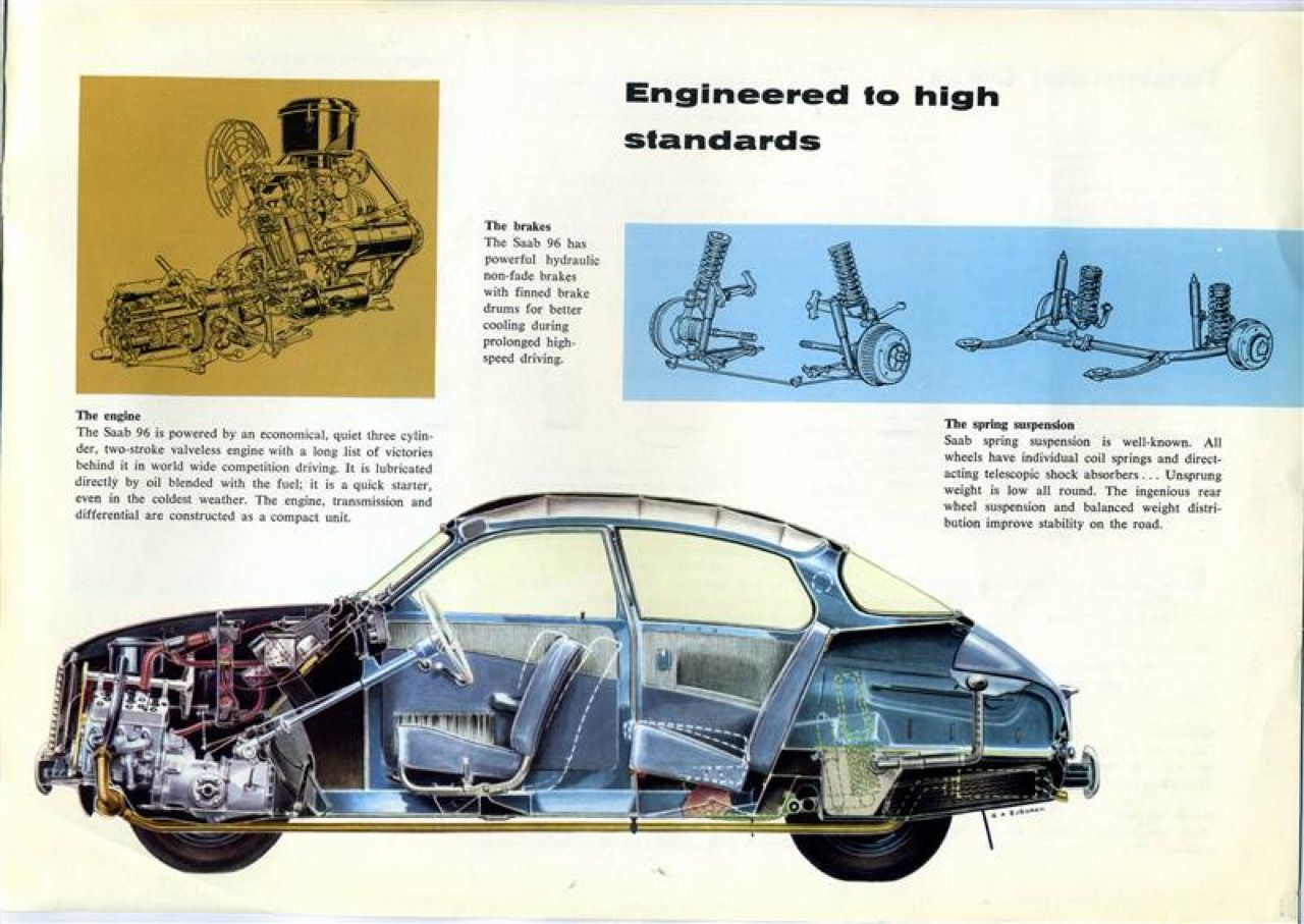 รถของ Saab รุ่นแรกที่มีการผลิตเพื่อการส่งออก คือรุ่น 96 ซึ่งขายตั้งแต่ปี 1960 ด้วยเวอร์ชันเครื่องยนต์ 2 จังหวะ จากนั้นในปี 1967 ก็มีเวอร์ชันเครื่องยนต์ 4 จังหวะ ซึ่งเป็นเครื่องยนต์แบบ V4 จาก Ford Taunus มาใช้ และยังเป็นรุ่นที่สร้างชื่อเสียงในมอเตอร์สปอร์ตเป็นรุ่นแรก จากการเข้าแข่งขันแรลลี่ Monte Carlo ภายใต้การบังคับควบคุมของนักแข่งชาวสวีเดนอย่าง Stig Blomqvist