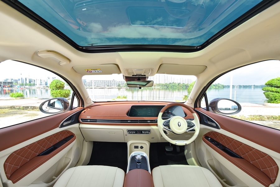 จุดเด่นในส่วนต่อมาก็คือ ความสะดวกสบายที่ครบคัน เห็นเป็นรถไฟฟ้าสุดน่ารักแบบนี้ แต่เจ้า Good Cat นั้นมาพร้อมกับฟีเจอร์ และอุปกรณ์อำนวยความสะดวกสบายที่ครบครันเทียบชั้นรถยนต์หรูจากค่ายยุโรปเลยก็ว่าได้ เริ่มมาตั้งแต่หน้าจอ Interactive Double Screen ที่เป็นหน้าจอ 2 จอเชื่อมต่อกันในขนาด 17.25 นิ้ว โดยแบ่งเป็นจอแสดงข้อมูลการขับขี่แบบดิจิตอล Full TFT ขนาด 7 นิ้ว และหน้าจอมัลติมิเดียระบบสัมผัส ขนาด 10.25 นิ้ว